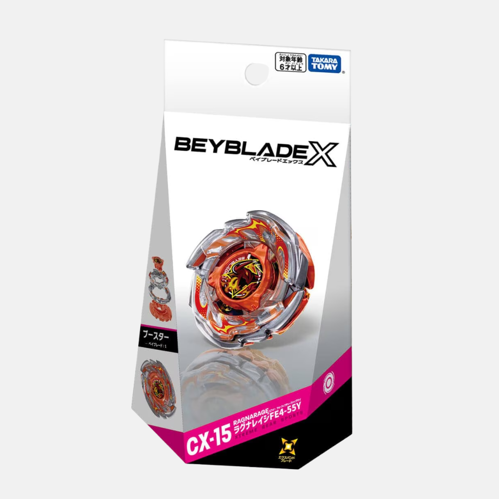 El CX-15 Ragna Rage FE4-55Y marca el retorno de una de las líneas de Resistencia (Stamina) más icónicas. Su ventaja mecánica radica en su impresionante aerodinámica modular de cuatro capas. Mientras el Lock Chip asegura la integridad, el Over Blade, el Metal Blade y el Assist Blade se combinan para crear un contorno fluido que minimiza la fricción del aire. Montado sobre el Ratchet para un centro de gravedad estable, y finalizado con el Bit, este combo está optimizado para adueñarse del centro del estadio y girar hasta el último segundo.